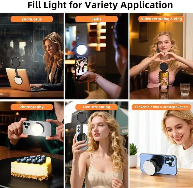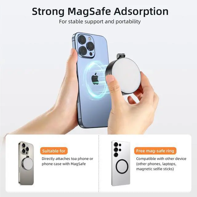 Magnetic Instant Attachment The magnetic ring light attaches instantly via MagSafe, providing immediate use and on-the-go lighting. Not only is it directly compatible with MagSafe iPhones, but the included magnetic adhesive patch also makes it compatible with other device (Android phones, laptops, magnetic selfie sticks, tripods, etc.). Whether live streaming, teaching online, or creating Vlogs, no worrying about device compatibility
