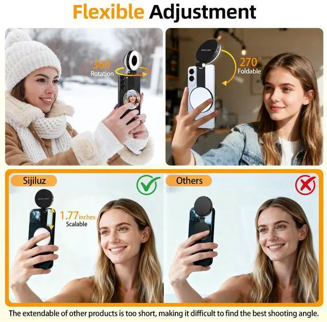 360° Rotation & 270° Foldable Design: The magnetic selfie ring light provides full 360° fill light coverage, making it an excellent choice for photography content creators. Simply rotate it to quickly convert it into a selfie light or photography light that enhances background illumination. Its 270° folding and 1.77 inches Extendable design helps find the perfect angle for better photos and creating a flattering effect on the face.