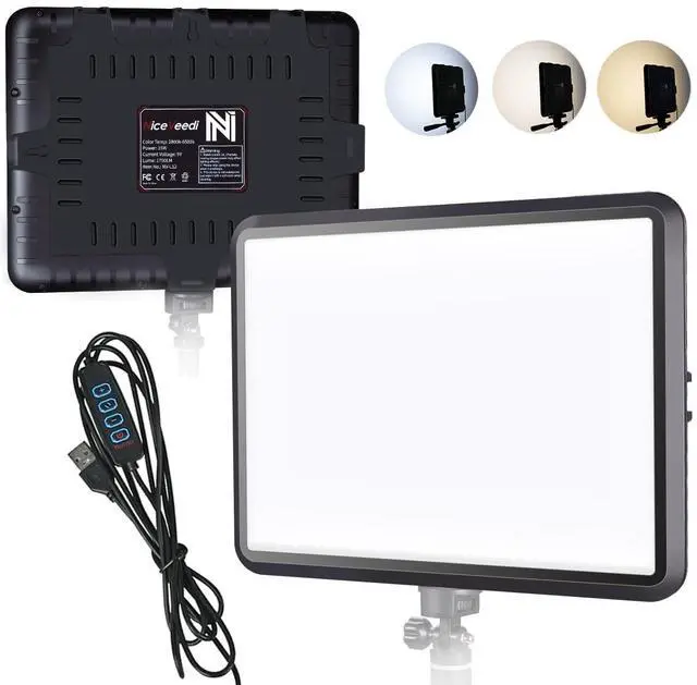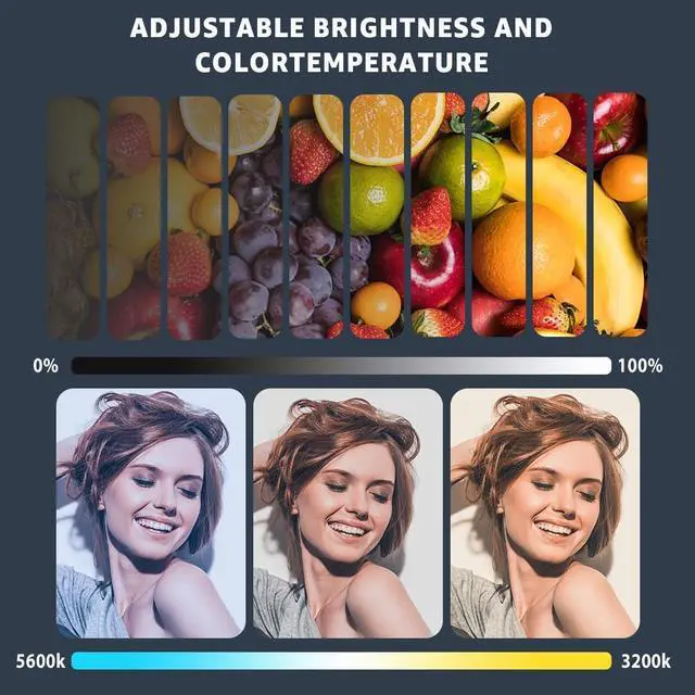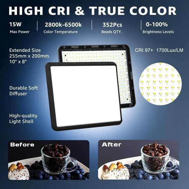 3 Color & Brightness AdjustmentThis Upgraded Studio Light equipped with 352 Led beads to make the light more stable and avoid flickers. The brightness can be adjusted in a range of 10 to 100% with button up and down on. Provides 3 Color temperatures to create various lighting atmosphere. A high CRI of 97+ gives your work precise color rendering, offering wonderful lighting effect for your works.