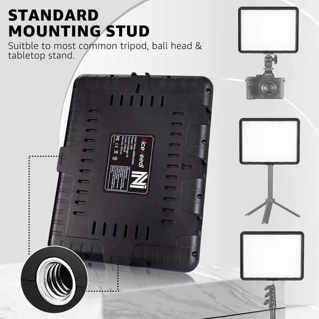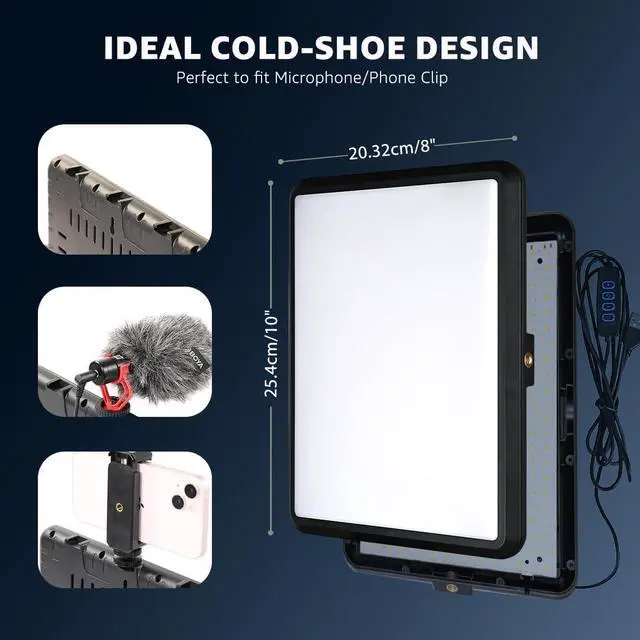WIDE APPLICATIONThis light panel is equipped with 2 standard 1/4" threaded holes and 2 cold shoe mounts, offering flexible mounting options. The cold shoe mounts make it easy to attach accessories like microphones or additional accessories, while the 1/4" threads ensure compatibility with tripods, light stands, and camera mounts. This versatile design allows you to build and adapt your setup for a wide range of shooting and streaming needs.