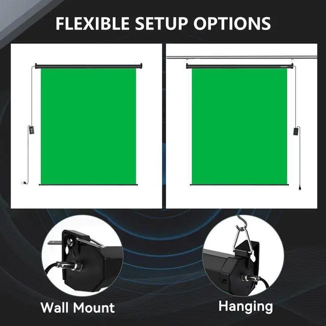 Dual-Side Power Design: Designed for ultimate adaptability, our retractable pull-down green screen supports both wall and ceiling mounting. The durable metal housing features power cable ports on both sides, so you never have to worry about the outlet locationmaximize your setup flexibility no matter how your space is arranged.