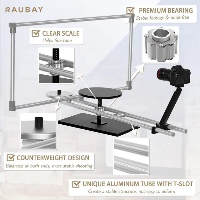 Sturdy and Well-built: All parts of 360 photo video platform are made of high-quality materials, and the round tube is specially designed with T-slot, which is less prone to deformation than ordinary round tubes, making the overall structure more stable and durable.