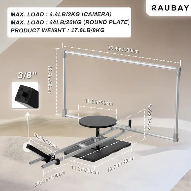 Flexibility and Practicality: The 360 camera platform can realize two assembly forms, which respectively support 360-degree horizontal surround shooting and 360-degree top view surround shooting. The camera can realize 120-degree vertical angle adjustment. The max. load for the camera is 4.4lb/2kg, and the payload of the round plate is 44lb/20kg. It is suitable for video production, commercial shooting, 3D scanning, 360-degree view construction.