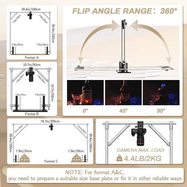 Flexibility and Practicality: Equipped with a camera quick-release plate and a mobile phone holder, it supports 360-degree flip shooting from multiple perspectives, and can support portrait shooting, product shooting and scene shooting. It is an excellent helper for photography studios and personal creators.