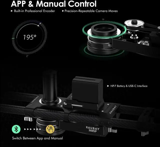 APP & Manual Control: RAUBAY 360° Spinner Pro Version delivers a breakthrough in precision and control. With built-in professional encoder, it enables smarter and hands-free shooting across multiple scenarios. For those times you need full manual control, we've also added a unique mechanical feature to switch settings.