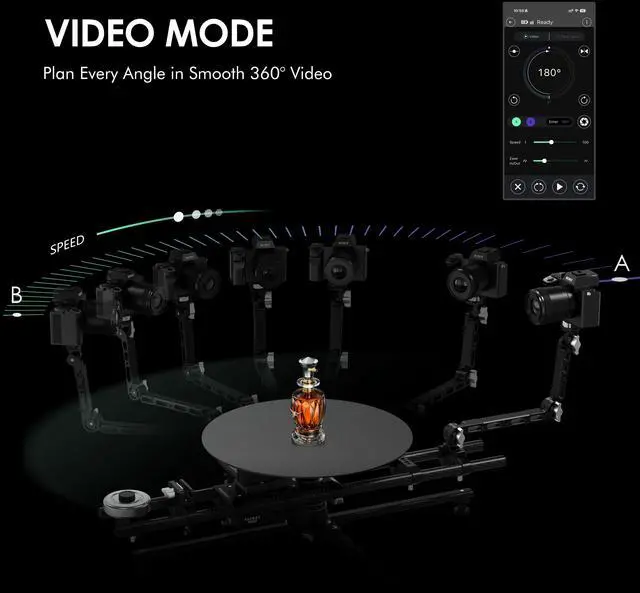 Video Mode: Without complicated setup, you can instantly start shooting after setting the speed you want, and you will get a smooth and customized video. Paired with A/B point settings, it's easy to plan rotation pathsideal for recording continuous footage of specific angles for product showcases and unboxing videos.