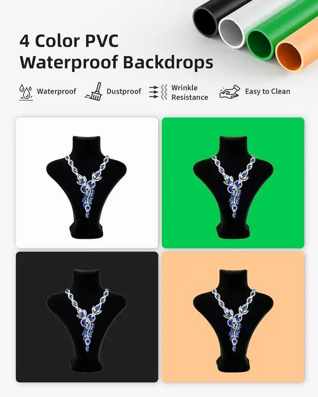 4 Color PVC Backdrops Transform your product photos with 4 detachable PVC backdrops in different colors (White/Black/Orange/Green). They' re made of high-quality, wrinkle-free PVC, so you can effortlessly switch backgrounds and create captivating scenes that make your products pop.