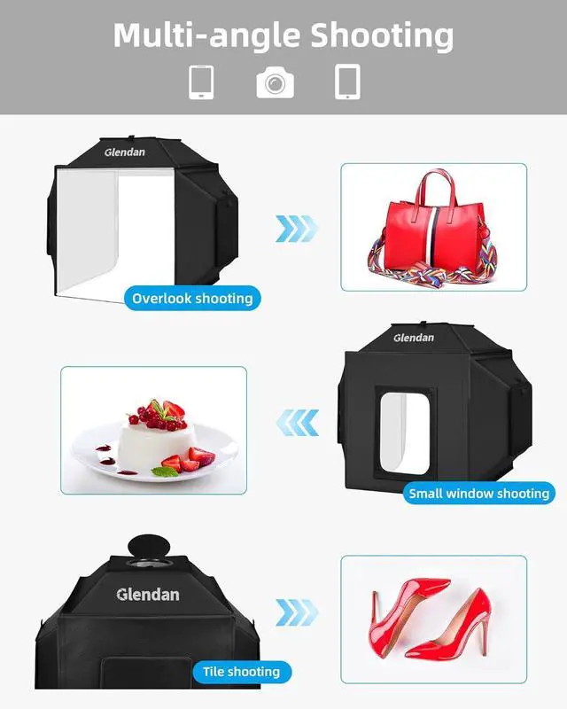 Upgraded 3 Light DiffuserNo more worries about shadows ruining your shots! Glendan' s light box has 3 light diffuser that soften the light, making it perfect for beginners and pros. Say goodbye to harsh lighting and hello to beautifully illuminated products. It' s like having a professional studio and a softbox all in one.