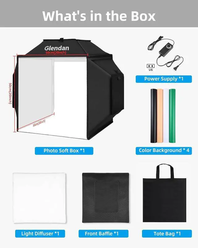Upgraded Light Box with 3 Light PanelsUpgrade your product photography with Glendan' s new 20" x20" light box photography. It comes with 3 improved light panels and 1222 high-quality LED lights, so you can say goodbye to shadows and hello to bright and vivid product images. Plus, it has a high color rendering Index (CRI) of 95+ for natural-looking photos with all the details.