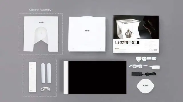 Components - 15 Studio Light Box / Front Cover / Halo Bars / Triple LED Lighting System / Dimming Controller / Power Adapter Kit (US, UK, AU, EU) / 2 Backdrops (White, Black) / Instructions // Free 360° Image Online Platform Access (SPINZAM)
