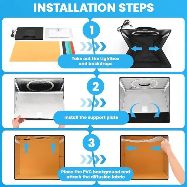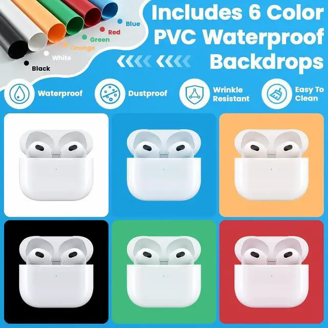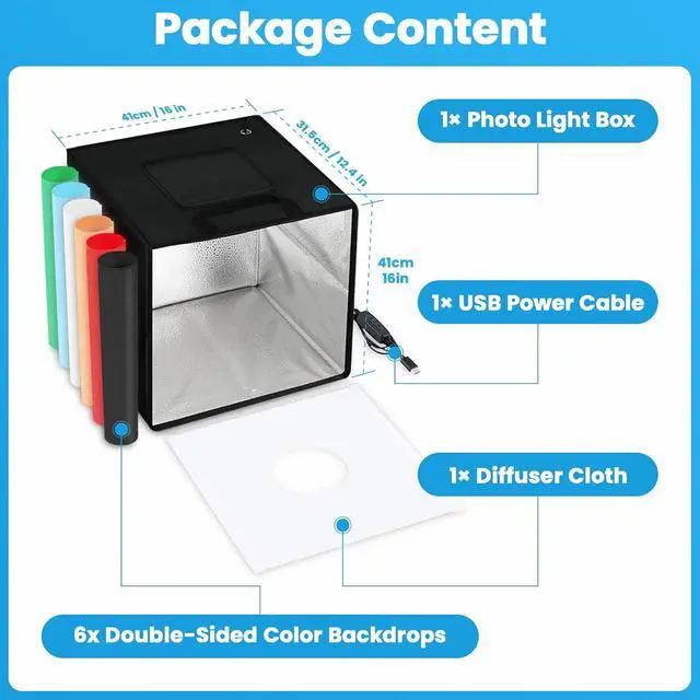 6 Color Backdrops: Our photo studio light box included 6 detachable backgrounds (White/Black/Blue/Green/Red/Orange) made of thick PVC, making it effortless to change background colors and create various shooting scenes.