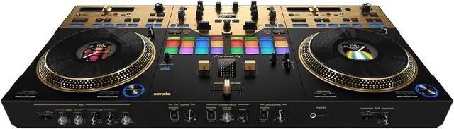 Pioneer DJ DDJ-REV7-N is a professional 2-channel DJ controller designed for scratch and open-format DJs. With its large motorized jog wheels, On Jog Display, and MAGVEL FADER, this unit provides an authentic vinyl feel, enhanced control, and top-tier performance capabilities for Serato DJ Pro and rekordbox users. The gold edition adds a premium aesthetic to your DJ setup.