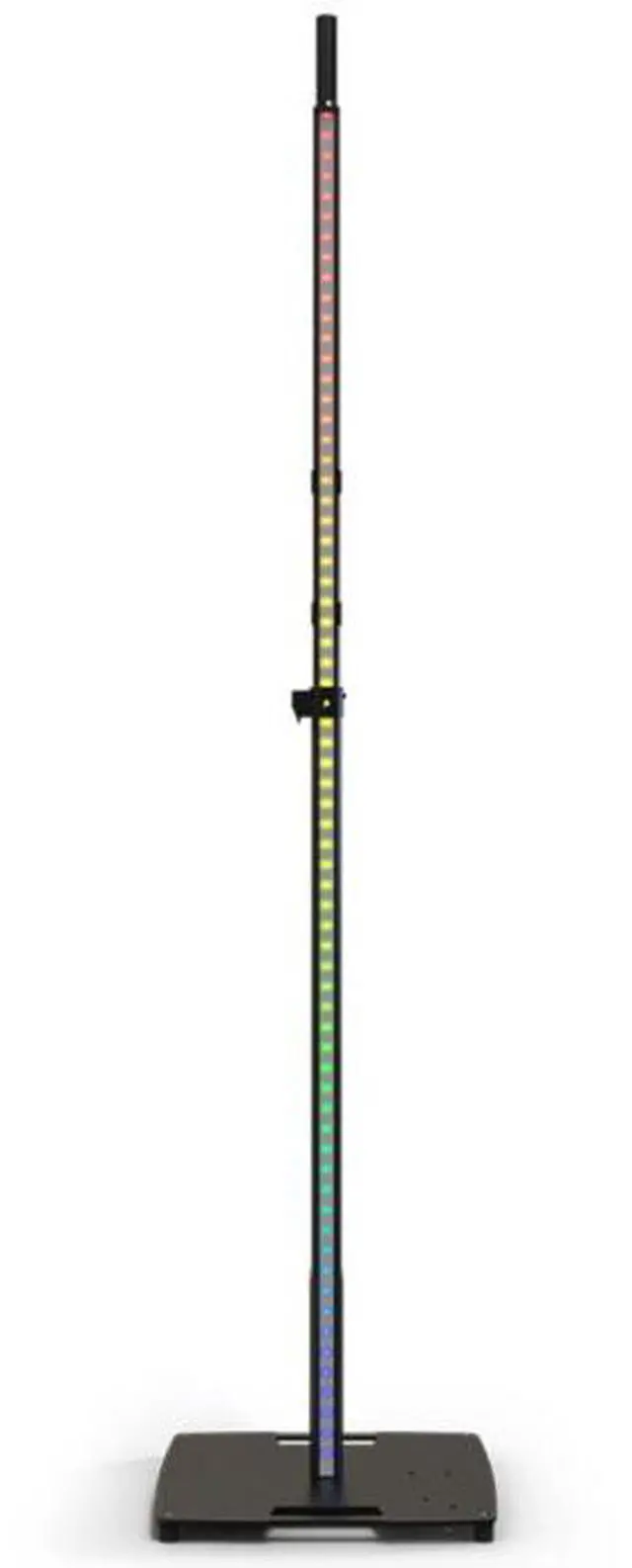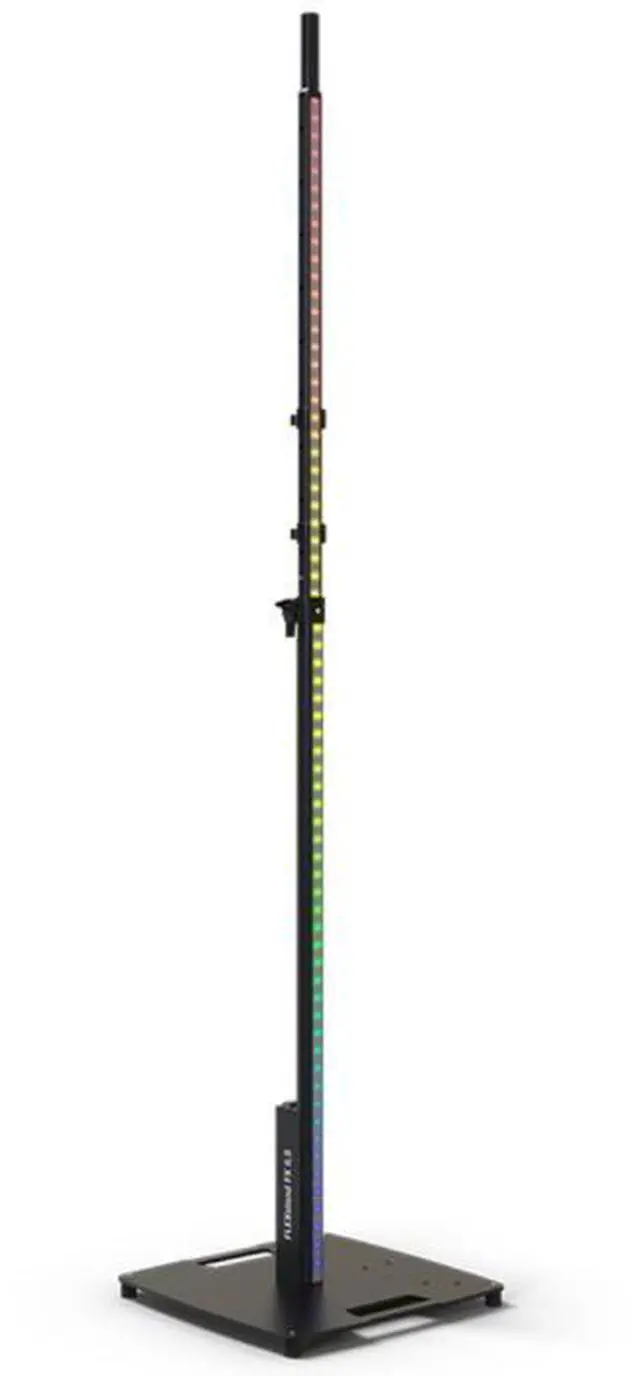 FLEXstand FX ILS streamlines your mobile rig by combining the utility of a speaker or lighting stand with integrated lighting effects. With 68 quad-color RGB+WW LEDs and compatibility with ILS, DMX, and RFC remotes, you can control this stand like any other fixture in your setup. Auto lighting programs dynamically adjust to match the stand height (4.8 to 8 ft), creating polished looks no matter the configuration. Its heavy-duty cast iron base and toolless setup make it a durable, time-saving solution. Threaded inserts on the top and bottom offer flexible mounting options for audio, lighting, or signage, while dual pole diameters accommodate standard clamps and fixtures. Whether youâ??re a mobile DJ, corporate AV provider, or stage designer, the FLEXstand FX ILS delivers reliable support and adds a new layer of visual impact without taking up extra space. Model Features