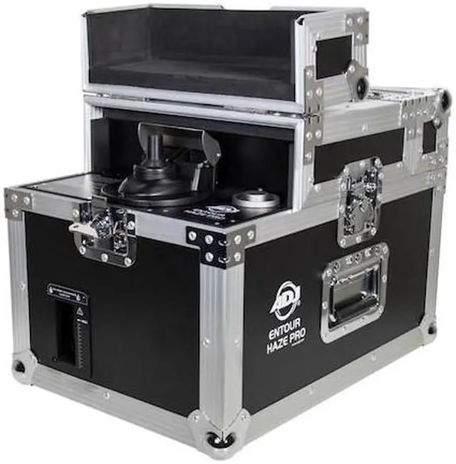 The ADJ Entour Haze Pro is a professional grade touring Haze Machine built into a durable flight case. This pro Hazer offers a very quick warm-up time and produces a massive amount of atmosphere.KEY_TAB KEY_TAB The Entour Haze Pro features an easy to read LED function display with timer, continuous haze and manual haze options. Connections include 3-pin and 5-pin DMX and PowerCON AC input. Uses high quality oil based haze fluid.