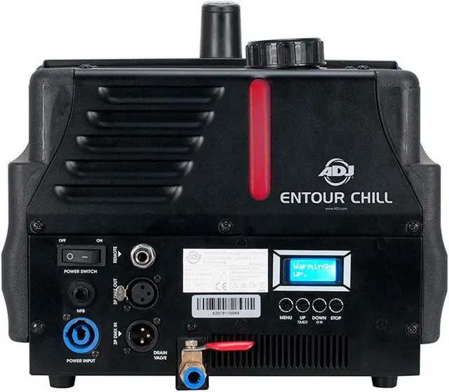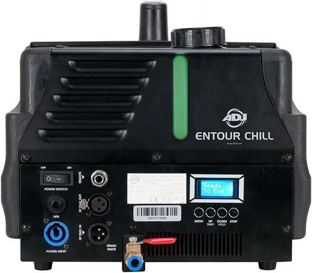 The ADJ Entour Chill is a high-output, continuous low-lying fog machine, which uses standard water-based fog juice and ice cubes to generate an effect similar to that of dry ice. This latest addition to the Entour range of professional DMX-controlled effect generators builds on the success of ADJâ??s immensely popular Mister Kool low-foggers, with enhanced technology to allow for increased output. A newly-developed 800W heater system allows for continuous output for up to an hour, while sophisticated new electronic temperature control lets the machine heat up in 3 minutes and stay at optimum temperature ready for immediate firing of the effect when it is required. Featuring an intuitive menu system accessed via a backlit 16-character LCD display, the unit is easy to setup for DMX control, remote control (sold separately), timed intermittent operation or immediate continuous output. Housed in a rugged, fire-resistant plastic case, the ADJ Entour Chill is ideal for use on theatrical productions and concert tours as well as by mobile entertainers and event companies. Order the American DJ Entour Chill today!