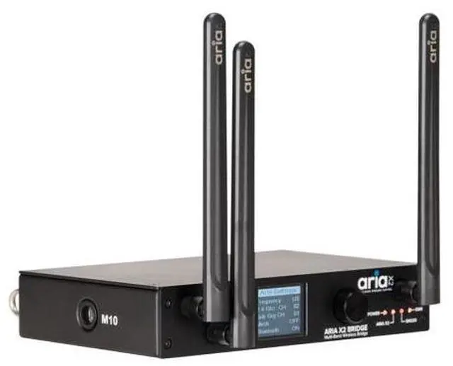 American DJ Aria X2 Bridge brings advanced wireless DMX functionality into a compact, versatile format for lighting professionals. Designed for seamless wireless DMX bridging, this device allows users to transmit or receive DMX data via wireless connections using multiple protocols. Whether linking Aria-compatible devices or extending an existing wireless lighting network, the X2 Bridge offers the control and adaptability demanded in modern lighting setups. Supporting both 900 MHz and 2.4 GHz RF bands, as well as Bluetooth 5.2, the Aria X2 Bridge can be operated through the Aria X2 BLE app or its onboard front-panel interface. It connects directly with major wireless DMX systems including ADJ WiFLY, Elation eFly, Magmatic MagFly, and Acclaim Aria. Thanks to its flexible configuration options, this bridge can serve as either a transmitter (DMX to wireless) or a receiver (wireless to DMX), ensuring maximum compatibility and integration across your rig. Built into a rugged metal chassis with M10/M12 mounting threads, a digital screen, and a rotary knob interface, the Aria X2 Bridge is designed for real-world use. With a power consumption of just 2W and advanced features like OTA updates and adaptive frequency hopping (planned), itâ??s a future-ready solution for dependable wireless lighting control. Aria X2 Bridge Features