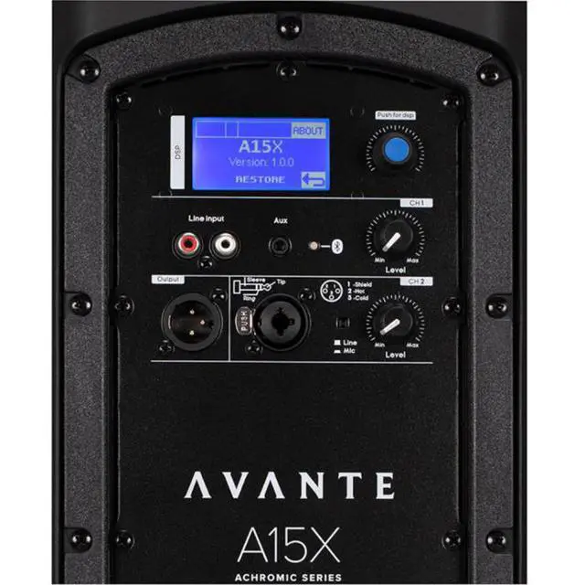 Avante Audio A15X is built to perform with a peak power of 1200 watts (350W Class D LF + 50W Class AB HF), producing a wide frequency range from 45Hz to 20kHz. Itâ??s equipped with a 15-inch woofer and a 1.35-inch high-frequency compression driver to ensure clean lows and crystal-clear highs. Ideal for mobile applications, the A15X features a rugged enclosure, lightweight 42 lb build, and practical design with top and side handles. It includes a user-friendly DSP interface with EQ presets for different environments and sound needs, as well as an energy-saving timeout feature. One of its standout features is full Bluetooth® 5.0 functionality. This allows music streaming or wireless control via the Achromic X iOS app, giving users hands-on control of settings remotely. Input versatility is also key, with balanced XLR/¼" combo inputs, RCA inputs, and XLR output for linking speakers. Whether you're setting up in a restaurant, lounge, or small stage, the A15X offers premium build quality and sound in a highly portable, flexible format. A15X Features
