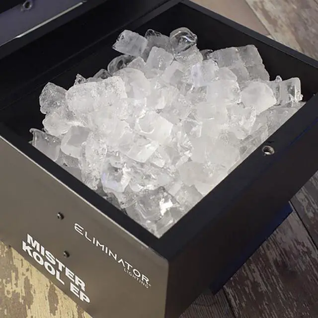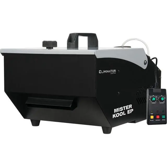 Create low-lying fog with the Eliminator Lighting Mister Kool EP, a unique fog machine that uses ice cubes and water-based fog juice to add dramatic, atmospheric effects for your light shows in small- to medium-sized clubs or venues. Mister Kool EP features a powerful 700W heater, a generous 25.6 oz tank, and a chiller box that stores 4 lb of cubed ice. The unit warms up within three minutes and is capable of rapidly diffusing fog at a rate of 3000 ft³/minute. The included wired remote is equipped with a 12' cable. It lets you operate the machine in manual, continuous, or time-controlled mode. In timer mode, two potentiometers allow you to set the duration and interval of fogging. A drainage system with a valve, plastic hose, and plastic water-collection bag can be used to empty the machine of melted ice. Compact and lightweight, Mister Kool EP is easy to store and transport with its integrated carry handle and robust metal construction.