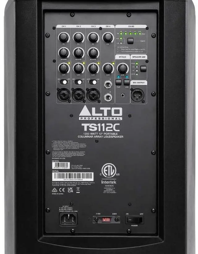 Alto TS112C is built to bring big sound and flexible control to compact performance spaces. With 1200 watts of Class D power, it drives a powerful 12-inch subwoofer and eight 2.75-inch high-frequency drivers for wide, even coverage and punchy lowsideal for vocalists, acoustic sets, fitness classes, DJs, and small to mid-size venues.