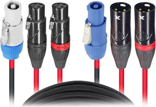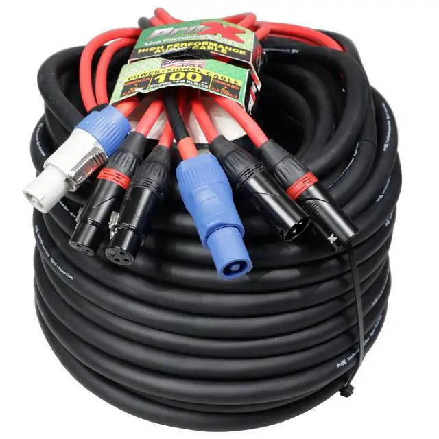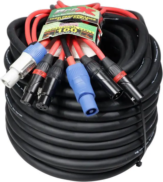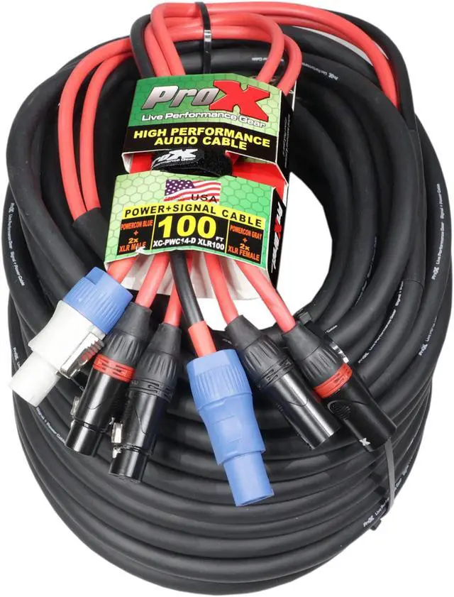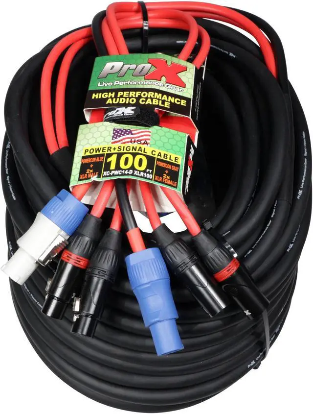 ProX XC-PWC14-DXLR100 100' Ft Dual 14AWG Powerkon to Dual XLR Combo Link Jumper Cable. This cable is ideally used when you want to minimize running cables from Power and XLR Audioto the desired sources. It saves you time and it is conveniently paired together. Avoid messy cables when multiple XLR and power sources are needed. Each connecting side includes 2x PowerKon Connectors and 2x XLRConnectors. 93% braided OFC Copper Compact shield to reduce noise and protect pure sound transfer. Each cableis constructedwitha compact cable diameter to decrease eddy currents. Bending, Twisting, are no match for our high-performance tour-grade audio cables.