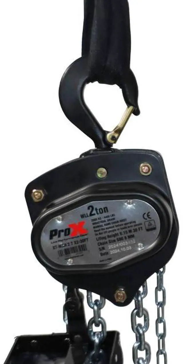 XT-MCH2T30FT Manual Chain Hoist by ProX offers dependable performance and professional-grade construction for lifting the heaviest loads in live event, staging, and industrial environments. Its rugged hardened steel construction and galvanized Grade 80 chain ensure exceptional strength and long-term reliability. The hoist's forged swivel hooks with safety latches rotate 360° to provide secure attachment and flexibility when rigging. A mechanical load brake guarantees positive load control, making lifting and lowering smooth and safe. Thanks to its portable and compact design, the XT-MCH2T30FT is easy to set up and operate anywhere, making it a crucial tool for touring, festivals, and permanent installations alike. With a lifting capacity of 2 tons and a pulling force of 305N, this chain hoist is engineered to meet the highest standards for strength, safety, and ease of use. ProX XT-MCH2T30FT Features