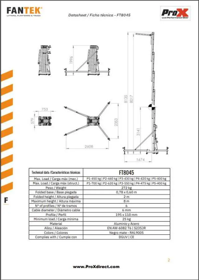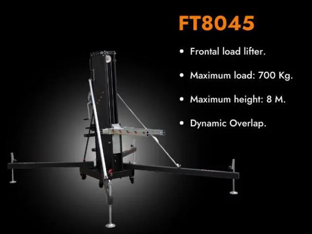ProX XTF-FT8045, manufactured by FANTEK® in Valencia, Spain, is a compact, front-loading lifting tower engineered for safely and efficiently flying line array systems, trusses, and LED screens. With a maximum height of 26.24 ft and a load capacity of up to 992 lbs, this tower is ideal for professional staging, concerts, rentals, and production use. Its robust build, patented safety systems, and compact folding design make it a reliable choice for demanding environments. ProX XTF-FT8045 Competitive Differences