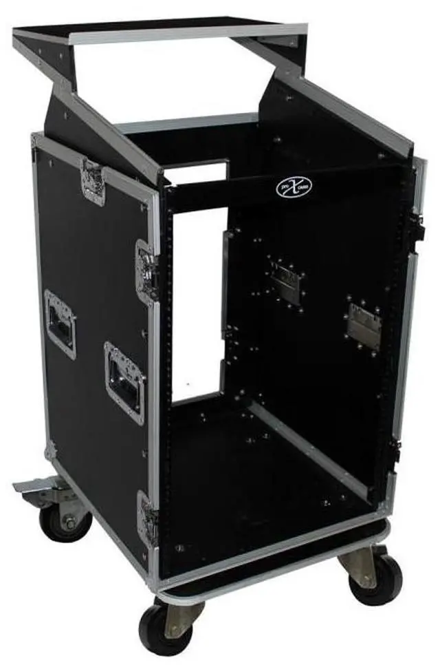 ProX Cases T-16MRLT, 16U vertical rack, 10U slant mixer rack system has all the best features you are looking for in a world-class flight case: strength, durability and reliability with flexible options and sizing for different applications.