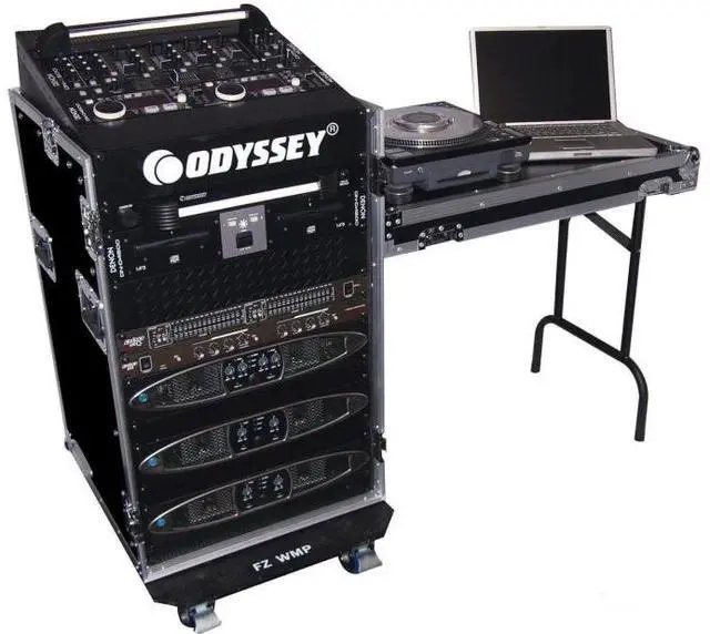 - Slanted top rack with 11 spaces for mixers and controllers