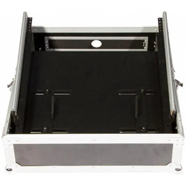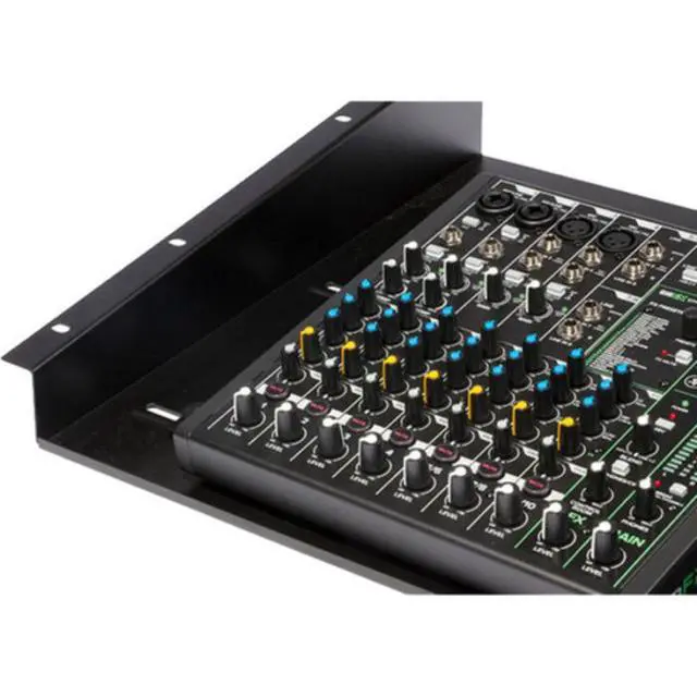 Our RSU1000 Rack Shelf mounts to the top of standard 19" racks, providing a platform that securely holds gear. Sliding, locking brackets adjust to match the width of equipment and hold it firmly in place. The shelf is angled downward for ease of viewing and operating a wide range of devices including mixers, laptops, DJ gear, and AV controllers.
