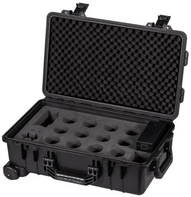 The Ape Labs Can 2.0 ABS Charging Case is a robust and waterproof IP65-rated case designed to securely store, transport, and charge up to twelve Can 2.0 fixtures. Ideal for professional events and demanding environments, this case ensures your lighting equipment is protected from the elements while on the go. With a built-in power supply and ground contacts, the ABS Case allows you to conveniently charge the Can 2.0 units without individually plugging them in. Simply slide them into the case and plug the entire case into a wall outlet. Equipped with wheels and a telescopic handle, the ABS Case provides easy mobility, making it perfect for both indoor and outdoor applications.