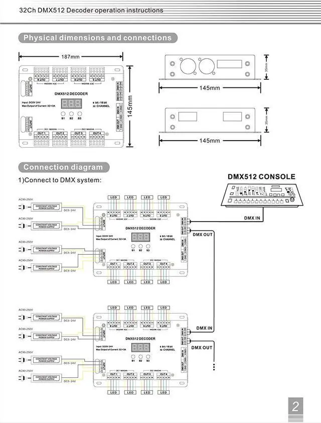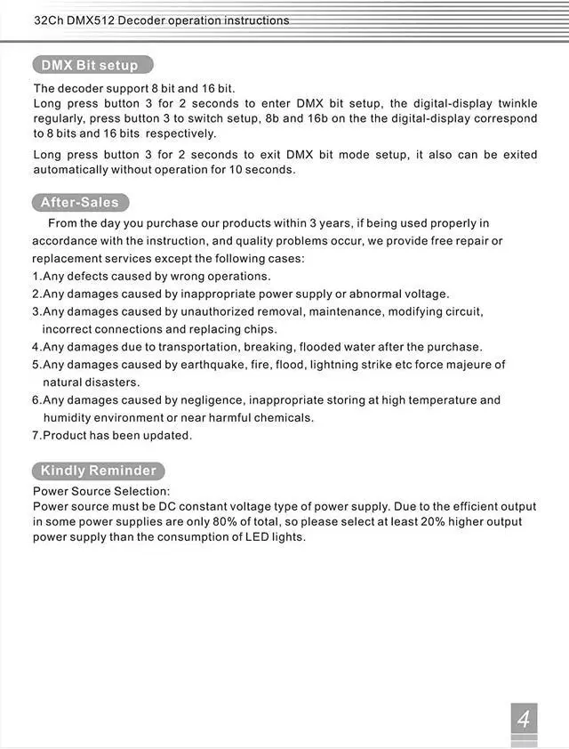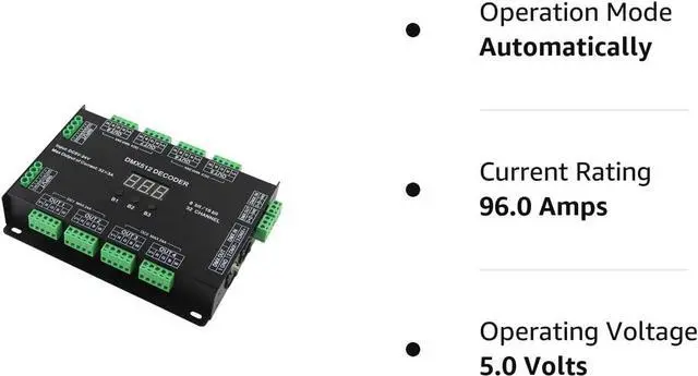• Automatically adapts to input voltages between DC5-24V. Power loss memory. Incorrect wiring protection at DMX port.