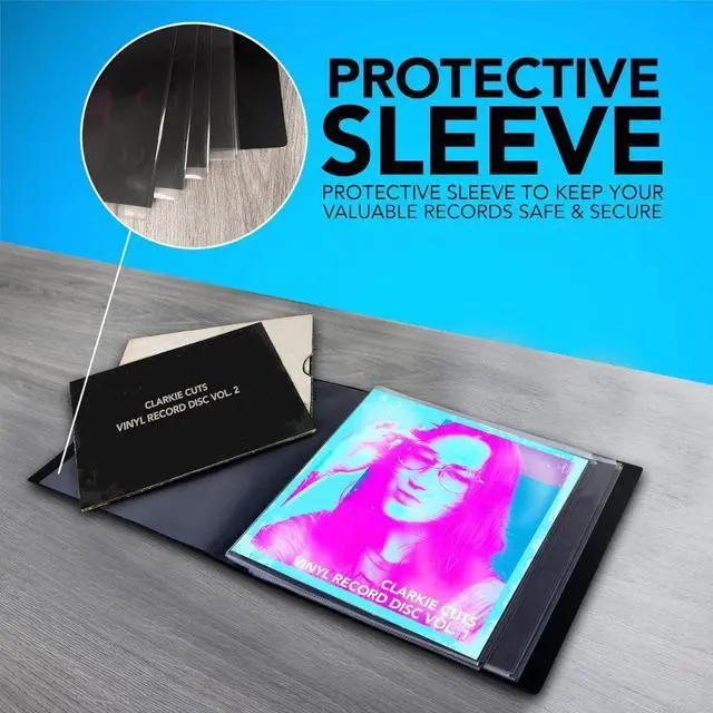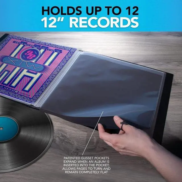 Itoya holds twelve standard vinyl records. One record fits perfectly in each of the twelve acid-free, polypropylene pockets, and each pocket has a patented gusset that expands when the record sleeve is inserted. The pockets stay flat and don't buckle or twist, allowing each page to be turned effortlessly as you flip through it. Thick gauge, black, acid-neutral paper is included in each pocket to keep the backsides of your record sleeves archival-safe and secure. The ProFolio has a customizable, reversible spine for easy labeling and comes with a durable, black, polypropylene, acid-free sleeve to protect the entire album as it sits on your bookshelf or during transport.