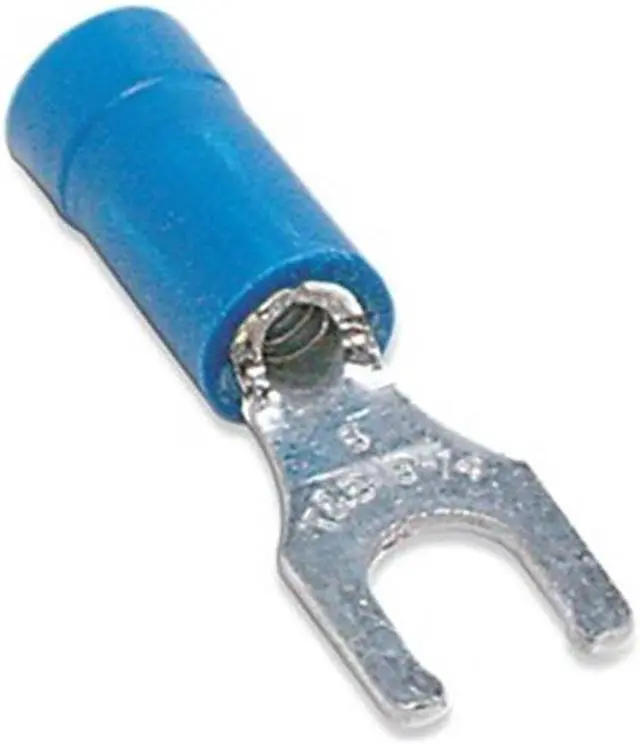 Fork Terminal, Contact Finish Tin, Contact Material Copper, Insulation Color Blue, Insulation Coverage Partial Coverage, Insulation Material Vinyl, Maximum Operating Temperature 221 Degrees F, Maximum Voltage 600 V, Maximum Wire Size 14 AWG, Stud Size #6, Termination Style Crimp, Tongue Length 0.4 in, RoHS Compliant No, Seam Style Brazed, Standards CSA Certified, UL Listed, Barrel Length 0.54 in, Barrel Style Insulation Grip, Compatible Grainger Part Number 3KH46, 3KH52, 4XMR5. This item has been restricted from sale in the following state (s): []