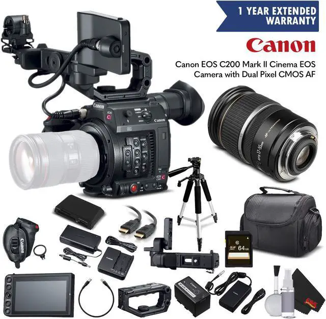Canon's EOS C200 EF Cinema Camera featuresKEY_TAB a built-in EVF, 4" LCD screen, top handle,KEY_TAB Super 35mm CMOS sensor, and Dual Pixel Autofocus. The EF lens mount on the EOS C200 offers compatibility not only with Canon's existing broad range of DSLR lenses but also with their line of EF-mount CN-E cinema prime and zoom lenses. The Super 35mm sensor is paired with Canon's Dual DIGIC DV 6 image processor, allowing it to capture and record up to 4K DCI resolution.