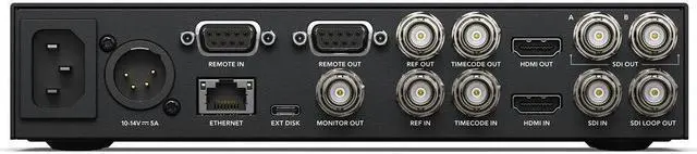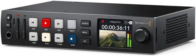Blackmagic Design HyperDeck Studio HD Plus. The 1 RU tall recorder is 1/2 of a rack wide and powers from 100 to 240 VAC or via an optional 12 VDC power supply for portability. Featuring one 6G-SDI input, one HDMI 2.0 input, two 6G-SDI outputs, and one HDMI 2.0 output, this unit is a compact recording/playout powerhouse. A loop-through output and 3G-SDI monitor output as well as reference and timecode in/out, allow this device to fit into a broadcast environment.Two SD card slots allow you to capture with virtually unlimited record time, and the unit also supports recording to USB disks via the USB Type-C output port. The HyperDeck Studio HD Plus features a front-panel button control and a jog/shuttle wheel for an analog scrubbing feel. RS-422 control is supported for external control, and you can also control the unit using either the USB port or over Ethernet at 1G speeds for faster deck control and file transfers via the RJ45 connector. An integrated LCD on the front panel allows you to monitor the video.