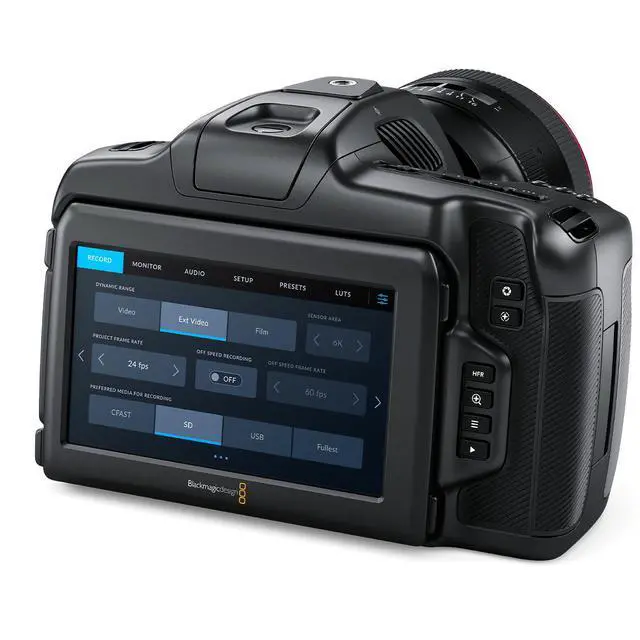 Plus the 6K models feature alarger Super 35 sensor that allows shooting with ashallow depth of field and anamorphic lenses. Allmodels let customers shoot up to 60 fps or 120 fps windowed. Anamazing sensor combined with Blackmagic color science means customers get the same imaging technology as the most expensive digital filmcameras. Blackmagic Pocket Cinema Camera features alarge, bright 5 inch touchscreen that makes it easy for customers to frame shots and accurately focus. Onscreen overlays show status and record parameters, histogram, focus peaking indicators, levels, frame guides and more.