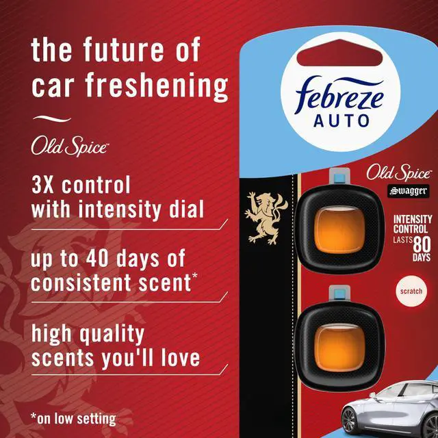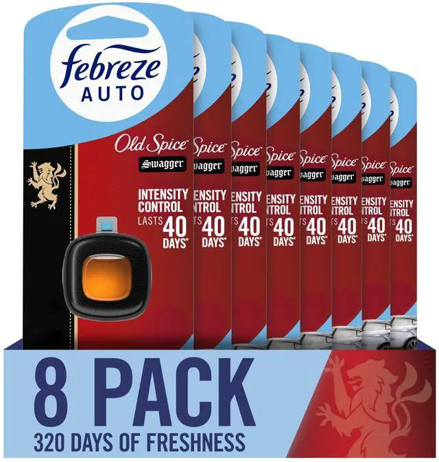 Kick car odors to the curb and enjoy up to 40 days of consistent scent with Febreze AUTO. While other car refreshers start off like a floral punch in the face, Febreze smells just right, right away. Youll get that first-day Febreze fresh for up to 40 days courtesy of its patented Steady Release Technology. This car air freshener vent clip is a breeze to install: Just unfold the clip until you hear a click, then clip it to your vent. It uses your cars fan to circulate an even scent through your entire vehicle. With the breezy, island scent of Old Spice Swagger, your ride is now a day at the beach. These tiny car deodorizers are made with odor fighters that fight any car stink with a scent that lasts. So forget those overwhelming, fade-too-soon fresheners and enhance every drive with the long-lasting freshness of Febreze AUTO. Want a fresh that lasts at home, too? Try Febreze Fade Defy PLUG.