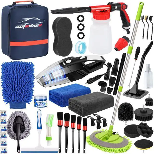 | Included Components | long handle mop, low-pressure foam gun with twist nozzles, quick coupling & leaking-proof tape, vacuum with long cord & 5 attachments, 3 drill brushes, windshield cleaning tool, spray bottle, 2 drill polishing pads, woolen polishing pads, wash sponge, 4 hooks, 5 detailing brushes, 3 wire brushes, large wash mitt, 2 towel, window water scraper, air conditioner brush, stone clearing hook, duster, storage bag |