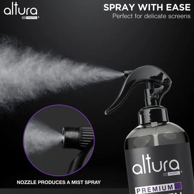 The Altura Photo Cleaning Solution is a professional cleaner that allows you to safely clean screens and optics without leaving any residue. It dissipates static without using harsh chemicals such as alcohol, ammonia or detergents.