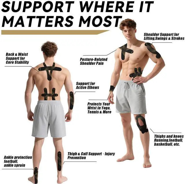 Pro Support & Performance Boost This athletic tape stabilizes muscles and joints without limiting mobility. Helps reduce strain, boost endurance, and support shoulder, knee, and back pain relief.