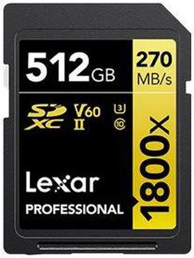 The 512GB Professional 1800x UHS-II SDXC Memory Card (GOLD Series) from Lexar features a storage capacity of 512GB and takes advantage of the UHS-II bus to support advanced DSLR functions such as continuous shutter bursts and rapid shooting, as well as raw and JPEG captures. This card is also well-suited for video capture, including 4K, 3D, and Full HD video, and can achieve maximum read speeds of up to 270 MB/s and maximum write speeds of up to 180 MB/s. Thanks to its V60 speed class rating, minimum write speeds are guaranteed not to drop below 60 MB/s.