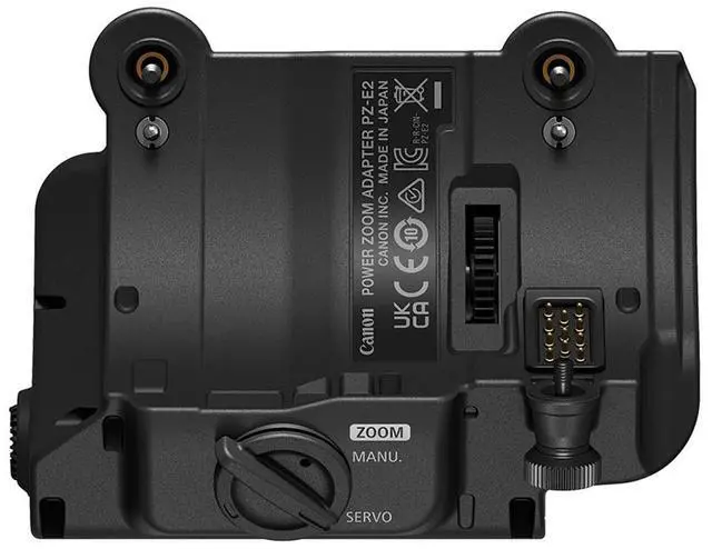 The adapter attaches directly to the RF24-105mm F 2.8 L IS USM Z lens, drawing power from the camera through contacts on the lens, eliminating the need for batteries. The PZ-E2 Power Zoom Adapter is designed for easy attachment and detachment without the need for special tools. Simply align the positioning pins with the sockets on the RF24-105mm F 2.8 L IS USM Z lens and turn the mounting screws to secure the adapter. The design allows for attachment or detachment even while the lens is combined with a rig, gimbal, or tripod, ensuring uninterrupted video production.