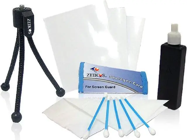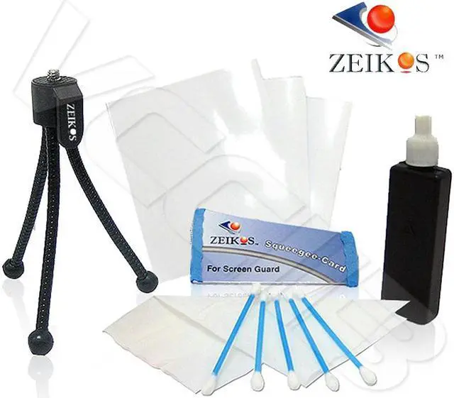 With Zeikos Deluxe Cleaning Kit w/Screen Guard Table Top Tripod help you keep your equipment in tip top shape. The kit includes a mini tripod, lens cleaning cloth, cleaning fluid, screen protector and five cleaning swabs. Its small enough to store in your camera bag and will come in handy to remove dust, dirt and fingerprints.Features: Accessory Value KitMini Travel TripodTop Quality Screen ProtectorCleaning Fluid5pc Cotton SwabsSoft-Tex Fiber Cloth