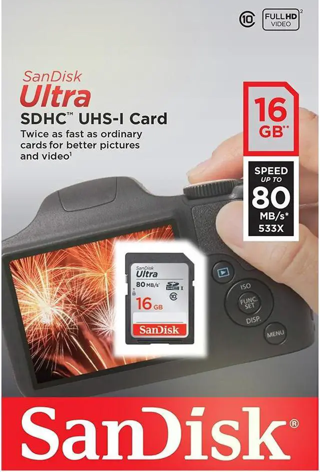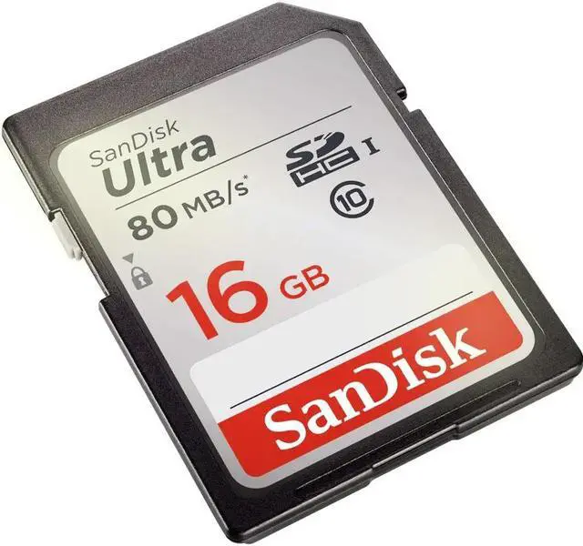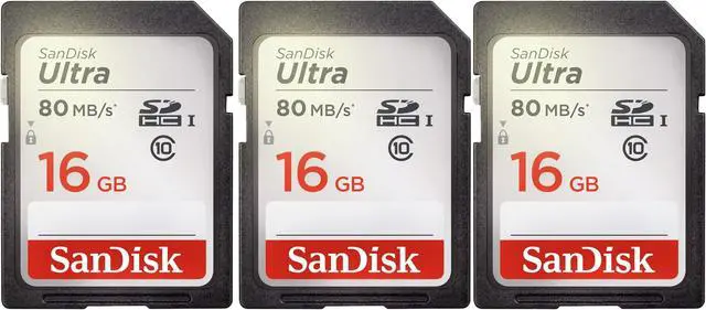3x SanDisk 16GB Ultra UHS-I SDHC Memory Card (Class 10) Record Full HD 1080p video with this Class 10 compliant 16GB Ultra UHS-I SDHC Memory Card from SanDisk. With enhanced data read speeds of up to 80 MB/s this Ultra SDHC memory card is designed to suit the needs of compact and mid-range point and shoot cameras. You can also save and store a variety of files such as music, movies, documents and more. The writable label found on the card allows you to write down what is saved to the card while the built-in write protect switch helps to prevent accidental data loss. This card, as with most SanDisk cards, comes shock, temperature, x-ray, magnet, and waterproof to take your files with you nearly anywhere you go.
