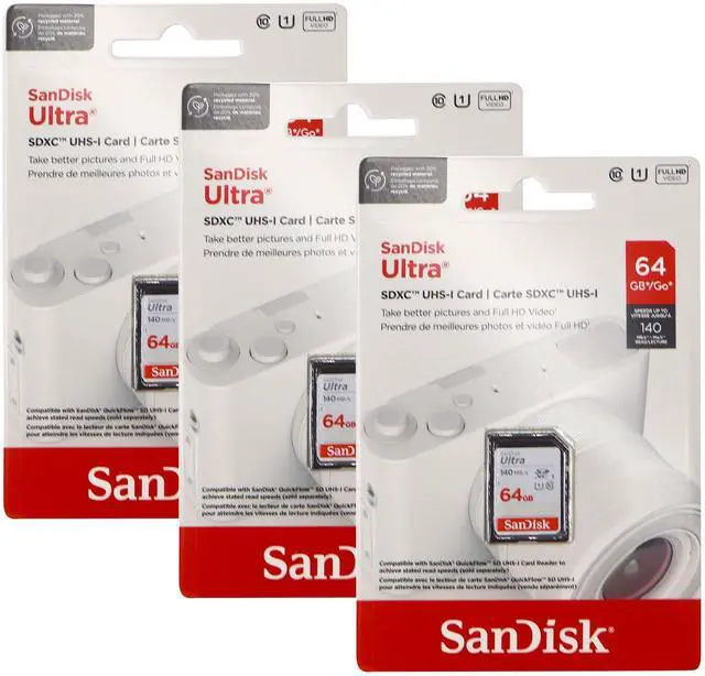 This Bundle from Teds Electronics includes: - 3x SanDisk 64GB Ultra SDXC UHS-I Memory Card - Up to 140MB/s, C10, U1, Full HD, SD Card - SDSDUNB-064G-GN6IN