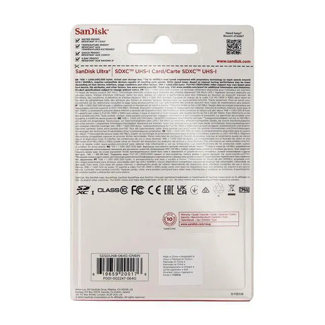 SanDisk 64GB Ultra UHS-I SDXC Memory Card The 64GB Ultra UHS-I SDXC Memory Card from SanDisk features a storage capacity of 64GB and takes advantage of the UHS-I bus to support DSLR functions such Full HD video as well as raw and JPEG captures. It can achieve maximum read speeds of up to 140 MB/s and, thanks to its U1/Class 10 speed class rating, minimum write speeds are guaranteed not to drop below 10 MB/s. This card is also resistant to water, shock, x-rays, and temperature extremes, while a write-protect helps safeguard any content for accidental deletions.
