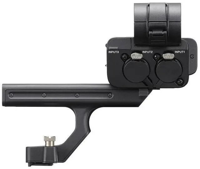 There is a microphone holder that can be used to mount a shotgun microphone to your system. It securely mounts to the camera's Multi Interface Shoe with two screws. Additionally, there are three 1/4"-20 accessory mounting threads.