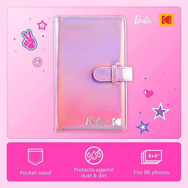 Preserve every precious moment with this 96-pocket photo album! This iconic Barbie x Kodak collaboration lets you organize all your 2x3 photos, keepsakes, cards, and more in one book-style album. Designed for use with your Barbie x Kodak Printomatic or Step Slim printer, this durable album features 16 individual pages for compiling a picture collage, sticker scrapbook, recipe card book, and beyond. Each page features space for up to six 2x3 photos, perfect for your 2x3 ZINK photo paper.