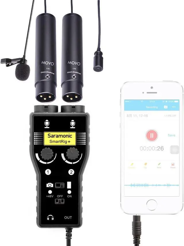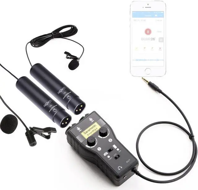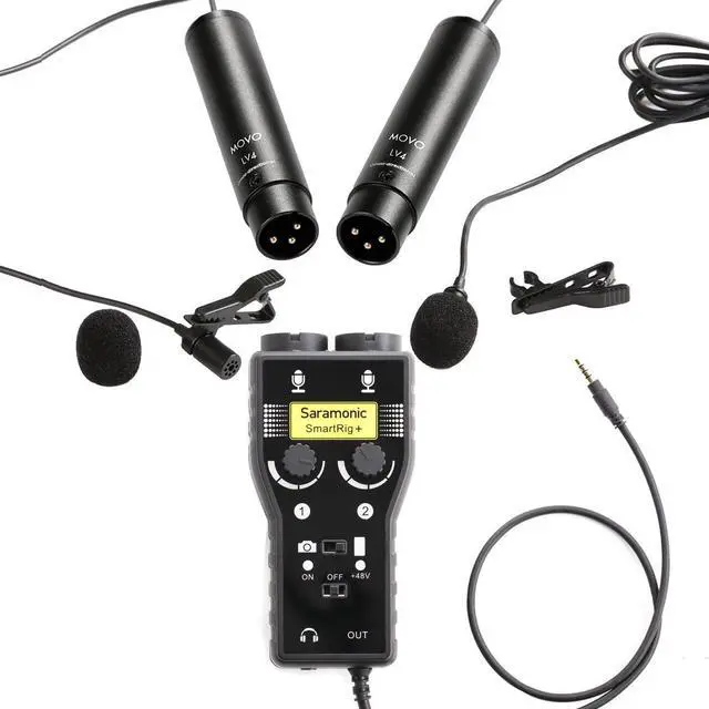 Movo Audio Bundle Including 2 XLR Lavalier Condenser Microphones and 1 Saramonic 2-Channel Pre-amp / Mixer for DSLR Cameras, Recorders, and Smartphones