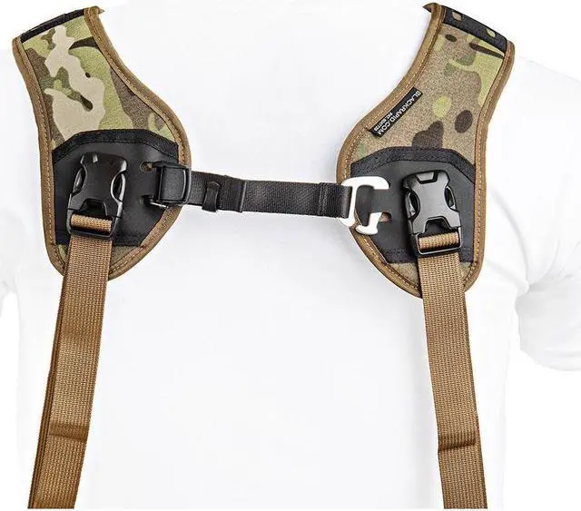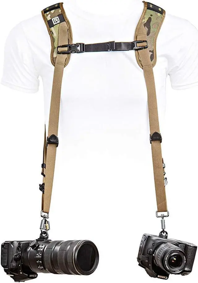 While capturing the essence of the wild or the thrill of an event, the Multi-Terrain Camo Dual Camera Harness ensures your cameras remain secure yet easily accessible. This double camera harness, often favored by professional event photographers, music photographers, press, fashion, street, sports, and wildlife photographers, is designed with a perfect blend of comfort, speed, and style.